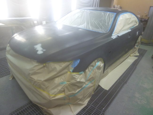 レクサスLS600h 塗装します マスキング工程 スターライトブラック塗装、クリアー塗装 焼き乾燥 各パーツ塗り ミガキ工程 各部組み付…