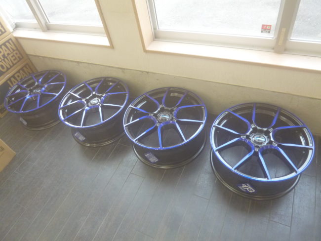 RAYS Gram Lights AZURE 57ANA レイズの新品ホイールの塗装です シルバーの部分だけキャンディーブルーに塗り分けします 足付け作業 マスキン…