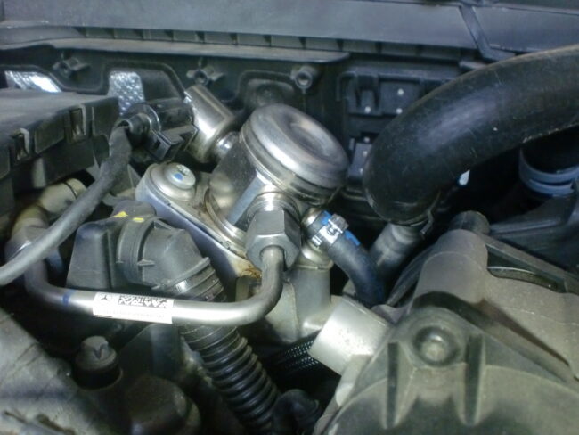 ベンツCクラス エンジンルームから燃料のニオイがします 外気導入で室内にも入ってきます 下から点検 アンダーカバーの左側に漏れ跡があります  …