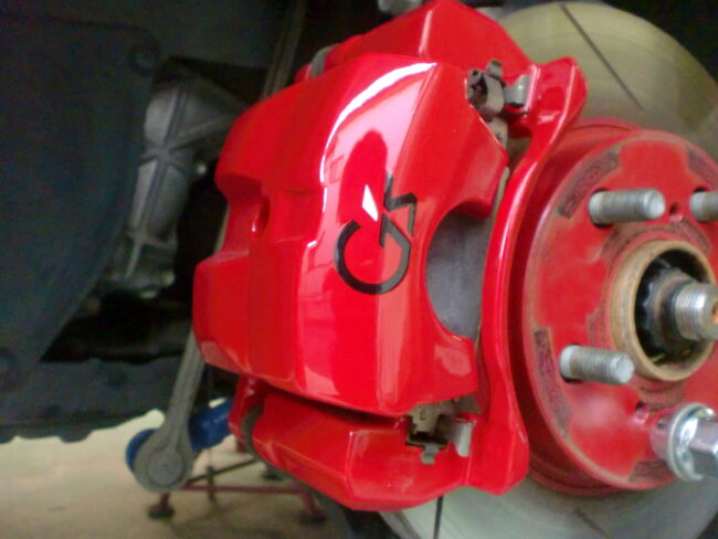 30プリウス キャリパー塗装、デカールを貼り付けてクリアーで仕上げます ホイールはG’s 4輪ジャッキアップ …
