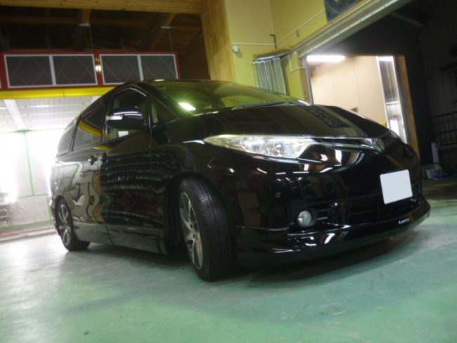 エスティマ ACR50 オールペン 完成です リアビュー 内板も塗装 KENSTYLE製フルエアロ装着 ブラックとシルバーのコントラストが映えてます …