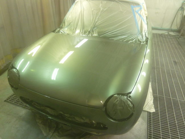 フィガロ塗装していきます 今回はホンダG550MシルバーミストグリーンMに塗ります 上部ルーフはホワイト(クリアー仕上げ) パーツ塗装 焼き乾燥 ミガ…